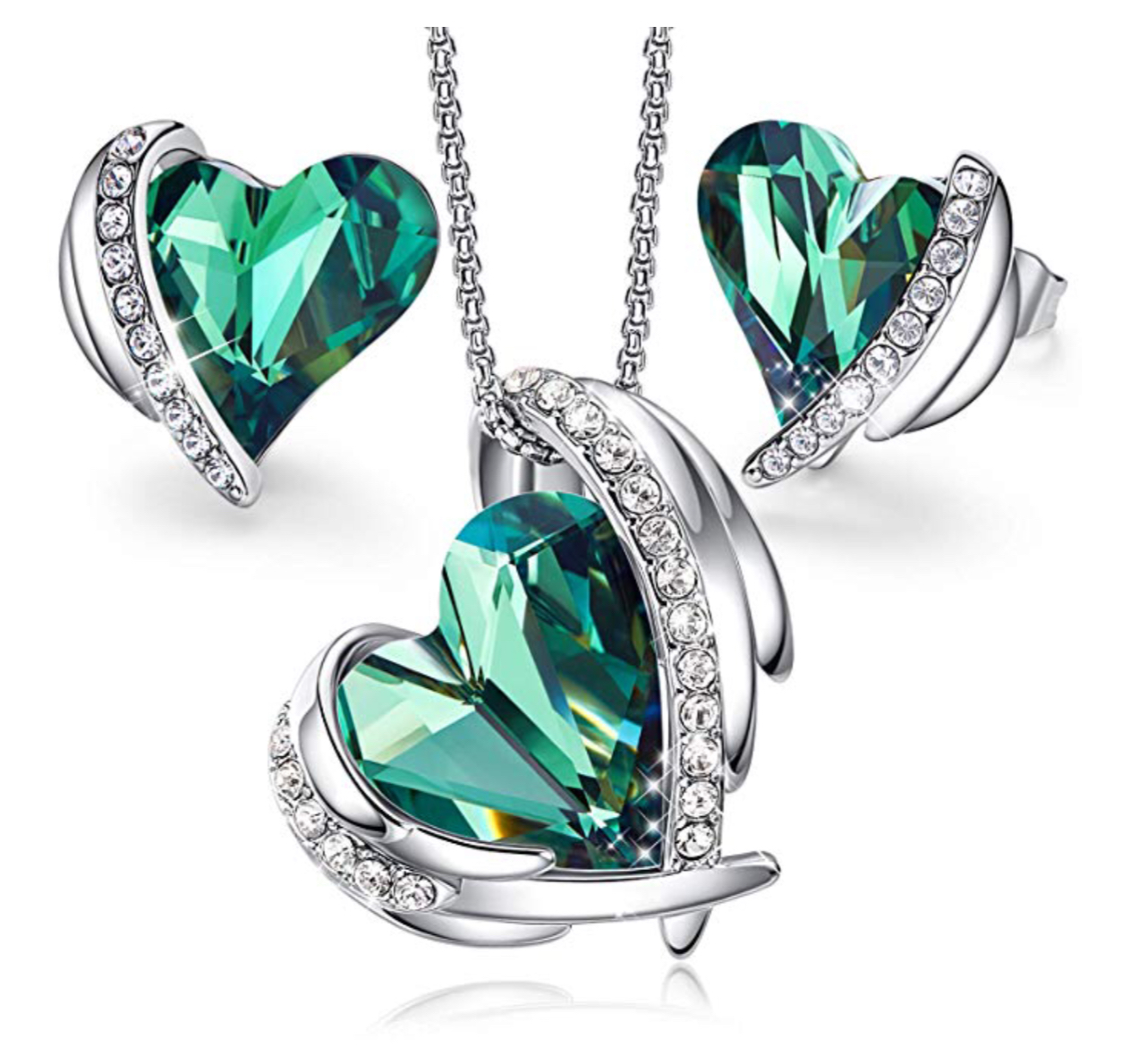 Prívesok náhrdelníka aj náušnice sú v tvare srdca vyrobeného z kvalitného krištáľu osadeného do tvaru anjelských krídel zdobené zirkónmi.